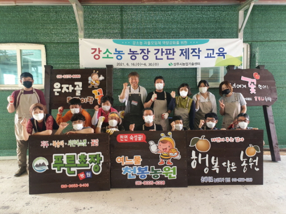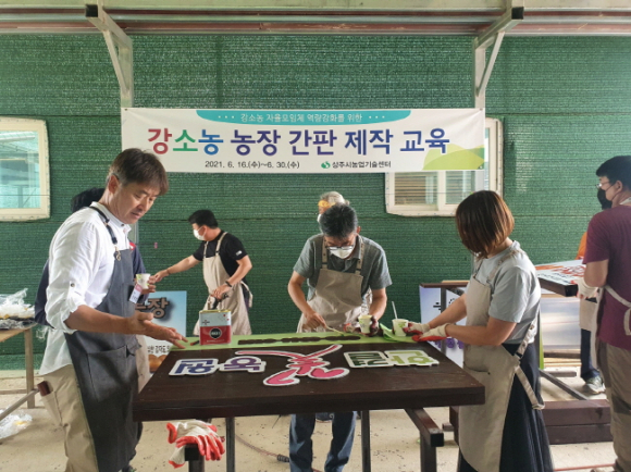 상주시농업기술센터는 강소농 자율모임체 역랑강화를 위한 “강소농 농장 간판 제작 교육”을 강소농 14명이 참석한 가운데 지난 6월 16일부터 6월 30일까지 총 3회 걸쳐 실시하였다. 강소농 자율모임체 회원들의 교육 요청이 많아 작년에 이어 올해도 실시하게 되었다. 각자의 개성을 살린 간판을 제작함으로써 농장의 차별화된 홍보를 통해 농가 소득 향상에 크게 기여 할 것으로 기대하고 있다. 이번 교육은 나래M&D 안두현 강사의 지도로 간판 디자인과정부터 간판도색 및 조립까지 전 과정에 농업인이 직접 참여하였다. 또한, 제작한 간판을 농가가 직접 농장에 설치함으로써 경영개선 실천의지를 높이고, 강소농으로서의 자긍심을 갖는 계기가 되었다.