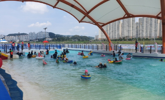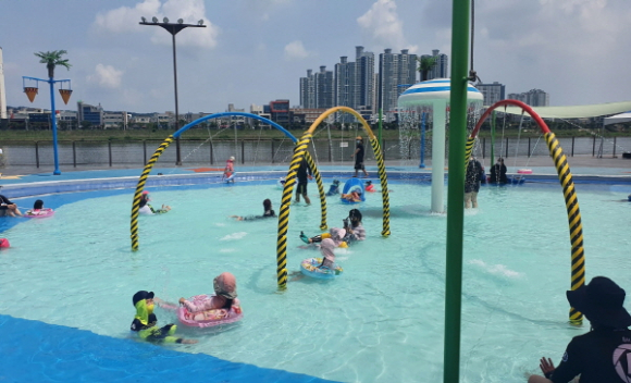 포항의 새로운 여름 휴가철 피서지로 떠오르는 형산강 야외 물놀이장이 성황리에 운영되고 있다.