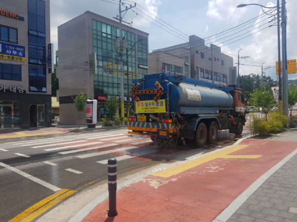 상주시는 폭염특보 발효 시 시내 주요간선 도로와 중앙시장, 풍물거리 등 23km 구간에 살수차 2대를 동원해 폭염 취약시간인 10시부터 16시까지 일 3~5회 도로에 물을 뿌린다. 살수차를 운행하면 약 3℃의 체감온도 저감 효과는 물론 노면 미세먼지와 비산먼지 저감 효과가 있고, 열로 인한 아스팔트 포장 구간 노면의 변형도 줄일 수 있다.