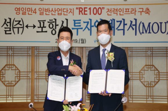 |  | | | ↑↑ 왼쪽부터 이강덕 포항시장, 허윤홍 GS건설 신사업부문대표 | | ⓒ GBN 경북방송 | | 포항시는 영일만4 일반산업단지가 코로나 등 경제 대변화 시기와 2050 탄소중립 글로벌 의제화로 100% 재생에너지를 사용하는(RE100) 발전 사업을 통해 실수요자에게 공급할 수 있는 에너지 자립형 산업단지로 도약하기 위해 GS건설과 투자협약을 19일 체결했다.