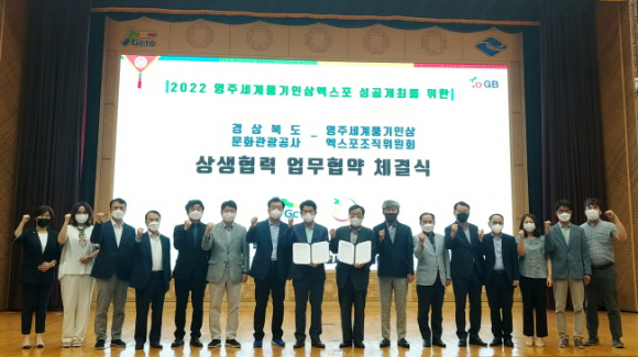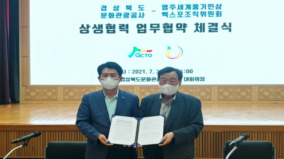 (재)영주세계풍기인삼엑스포조직위원회(위원장 이희범)는 20일 ‘2022영주세계풍기인삼엑스포’ 성공 개최와 상생협력을 위해 경상북도문화관광공사(사장 김성조)와 업무 협약을 체결했다. 협약식은 이희범 조직위원장, 김성조 사장 및 관계자 등이 참석해 ‘코로나19’ 확산 예방을 위한 사회적 거리두기 지침을 준수한 가운데 진행됐다. 이날 실시한 협약의 주요 내용은 △엑스포 홍보 및 국·내외 관람객 유치 활동 지원 △엑스포 연계 관광 상품 및 지원 사업 개발과 운영을 통한 협조 △연계 마케팅을 통한 경북 북부지역 상생 방안 마련 △양 기관의 상호 발전을 위해 필요한 사항 등을 포함하고 있다. 이희범 조직위원장은 “2022영주세계풍기인삼엑스포가 관람객 100만 명을 목표로 하는 만큼 이번 업무 협약으로 공사의 축적된 마케팅 역량을 활용한 엑스포 홍보에 많은 도움을 받을 수 있을 것”이라며, “엑스포의 성공과 경북의 관광활성화를 위해 함께 협력해 나가자”고 말했다.