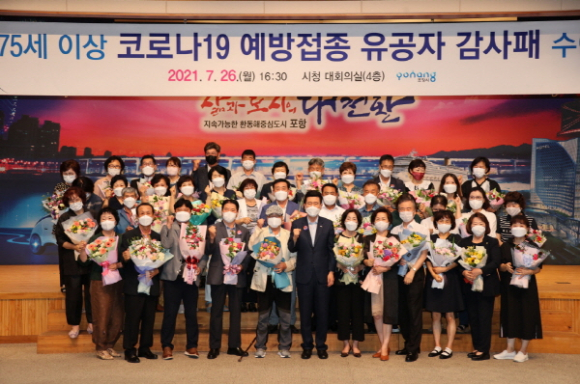 |  | | | ⓒ GBN 경북방송 | | 포항시는 26일 시청 대회의실에서 35명의 자원봉사자와 4개 자생단체에 대해 ‘75세이상 어르신 예방접종 유공자 감사패 수여식’을 가졌다.