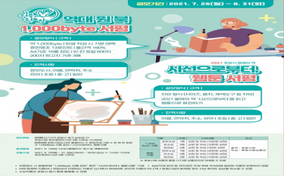 올해 공모전은 ‘역대 원 북 1,000byte 서평’, ‘시선으로부터, 웹툰서평’의 2부문으로 진행되며, 우편·인터넷으로 접수할 수 있다.