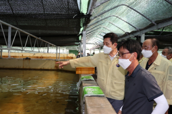 이강덕 포항시장은 30일 고수온으로 인해 양식어류 피해가 발생한 포항시 남구 호미곶면의 육상 양식장을 방문해 피해를 입은 양식 어업인을 격려하고 고수온 대응 상황을 점검했다.