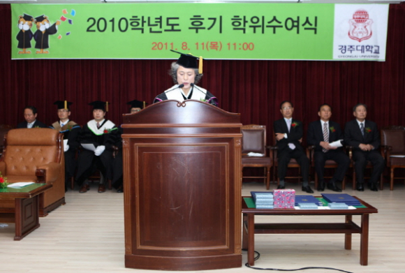 경주대학교(총장 이순자)는 8월 11일(목) 오전 11시 공학관 강당에서 이순자 총장과 설립자, 법인이사, 동문회장을 비롯한 학생·학부모 등 500여명이 참석한 가운데 제20회 후기 학위수여식을 가졌다.