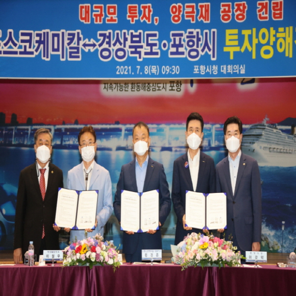 이에 포항강소연구개발특구 연구소기업과 지역 내 R&D를 기반으로 성장한 기업들이 공장 건립 단계에서 타지역으로 이탈하지 않고 지역 내 안착하며 중견기업으로의 성장을 꿈꾸고 있으며, 포항에 투자를 희망하는 관외 기업들의 입주 문의도 쇄도하고 있다. |  | | | ↑↑ 경상북도·포항시↔㈜포스코케미칼, 6,000억 원 투자양해각서(MOU) 체결 | | ⓒ GBN 경북방송 | | |