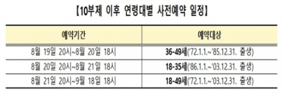△19일 오후 8시부터 20일 오후 6시까지는 36~49세(72~85년생), △20일 오후 8시부터 21일 오후 6시까지는 18~35세(86~03년생)의 추가예약이 진행되며, △21일 오후 8시부터 9월 18일 오후 6시까지는 18~49세 연령층에 대해 추가예약이나 변경 등이 가능하다.