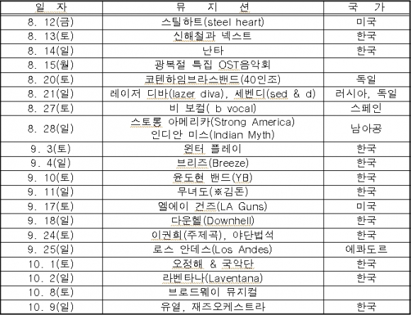 -12일 록의 전설 ‘스틸하트’ 시작 토일 저녁 7시30분 60분간 -록 팝 재즈 국악 뮤지컬 등 다양한 장르 ‘세계뮤직페스티벌’ -13일 신해철 14일 난타 27일 비보컬 등 20일간 24개팀 공연