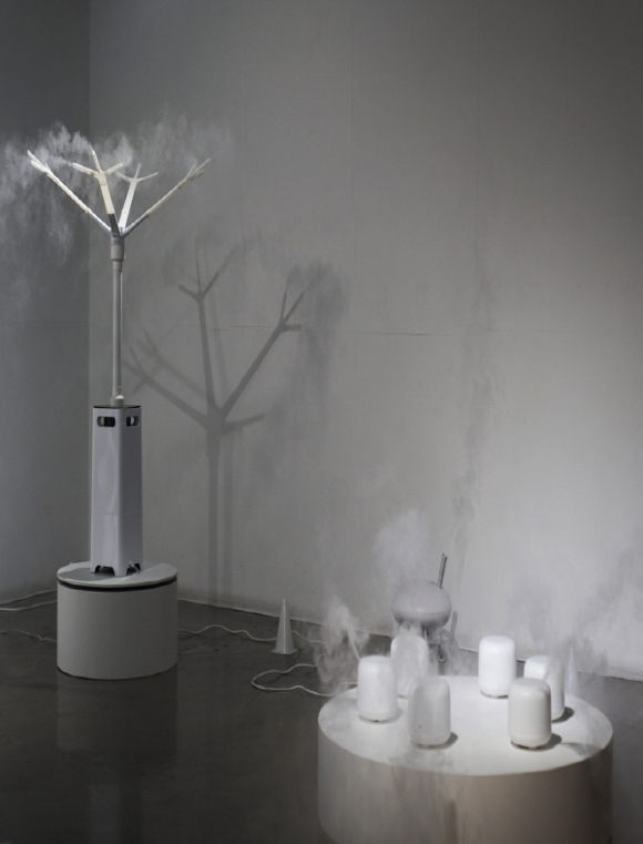 습기로 가득한 공간의 무거운 공기는 고스란히 이곳을 찾은 관객의 몫이 된다. 아직 가습기가 활동하는 시기가 아닌 이 여름의 기계의 과장된 노동은 우습지 않다.