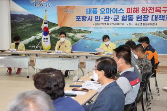 |  | | | ⓒ GBN 경북방송 | | 포항시는 27일 죽장면행정복지센터에서 제12호 태풍 ‘오마이스’ 및 8․24 집중호우로 막대한 피해를 입은 죽장면 지역의 완전복구를 위해 ‘포항시 민․관․군’ 합동 현장 대책회의를 개최했다.