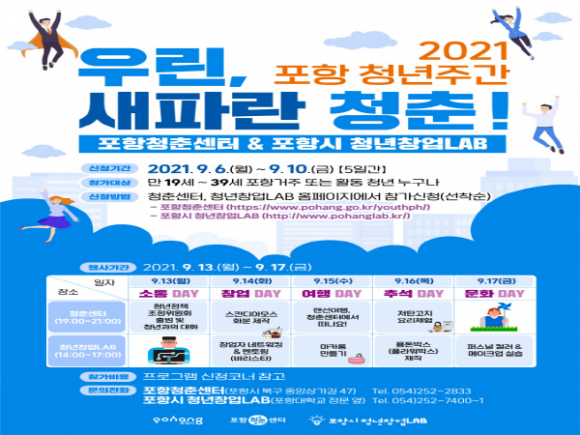 |  | | | ⓒ GBN 경북방송 | | 포항시는 ‘청년의 날’을 기념해 13일부터 17일까지 2021년 포항청년주간으로 정하고 오는 18일 ‘우린, 새파란 청춘’이라는 슬로건 아래 청년세대를 위한 행사를 포항청춘센터와 포항시 청년창업LAB에서 동시다발적으로 개최할 예정이다.