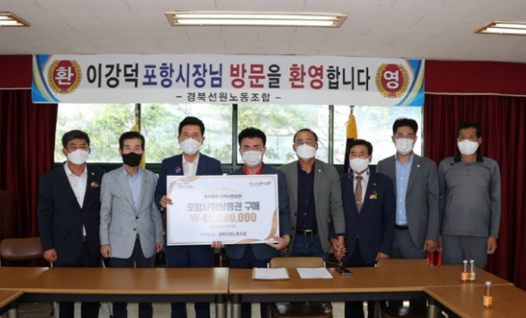 경북선원노동조합은 지난 9일 조합사무실에서 열린 상품권 구매 행사를 통해 상품권 4,500만 원을 구매했으며, 이날 행사에는 이강덕 포항시장, 이재곤 수산진흥과장, 김복근 위원장 등이 참석했다.