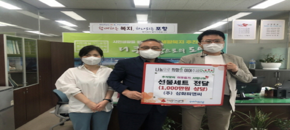 |  | | | ↑↑ 왼쪽부터 삼화피앤씨 최용미 전무, 한상호 복지국장, 삼화피앤씨 손위혁 회장 | | ⓒ GBN 경북방송 | | ㈜삼화피앤씨는 추석 명절을 맞이해 10일 포항시청을 방문해 사랑 나눔 이웃돕기 선물세트 46박스(1,000만 원 상당)를 전달했다.