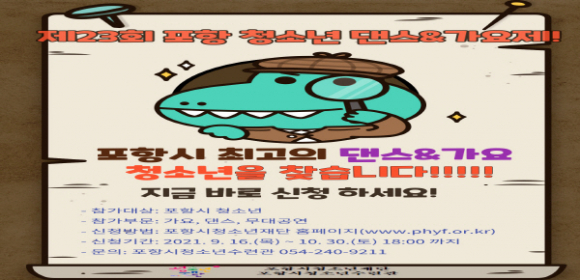 포항시청소년재단은 청소년들이 문화예술 관련 재능과 끼를 발산 할 수 있는 어울림의 장인 ‘2021년 제23회 포항 청소년 댄스&가요제’를 오는 11월 6일 개최에 따라 참가 청소년들을 모집한다.