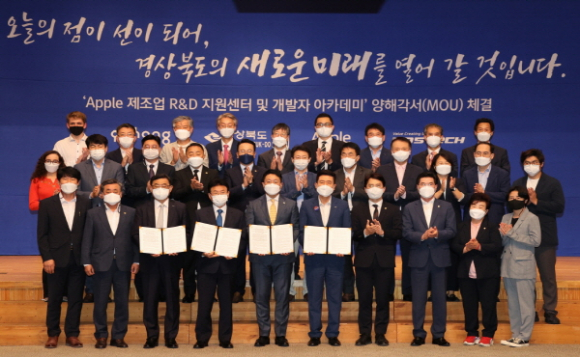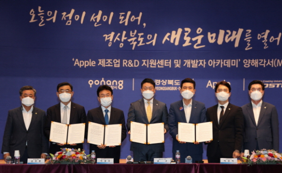 |  | | | ↑↑ 왼쪽부터 김무환 포스텍 총장, 이철우 경북도지사, 윤구 애플코리아 사장, 이강덕 포항시장 | | ⓒ GBN 경북방송 | | 포항시는 27일 오후 시청 대회의실에서 Apple, 경북도, 포스텍과 함께 ‘Apple 제조업 R&D지원센터’ 및 ‘Developer Academy’(이하 ‘개발자 아카데미’) 설립·운영에 관한 양해각서를 체결했다고 밝혔다.