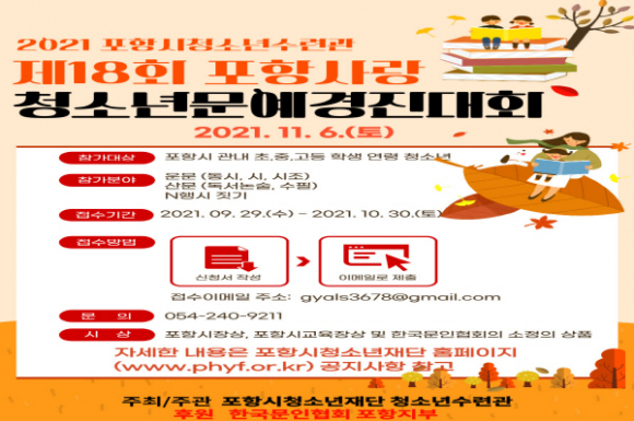 |  | | | ↑↑ 제18회 포항 사랑 청소년문예경진대회 홍보 포스터 | | ⓒ GBN 경북방송 | | 포항시청소년재단은 청소년들에게 책과 함께 하는 글쓰기 논술 등 창작 문예활동을 할 수 있는 ‘2021년 제18회 포항 사랑 청소년문예경진대회’를 오는 11월 6일 개최함에 따라 참가 청소년들을 모집한다고 밝혔다.