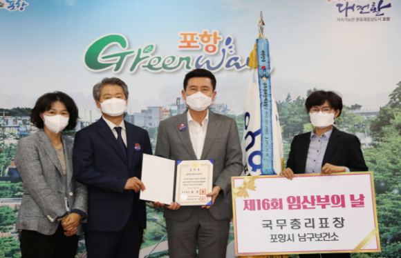 |  | | | ↑↑ 왼쪽 두 번째부터 고원수 남구보건소장, 이강덕 포항시장 | | ⓒ GBN 경북방송 | | 포항시 남구보건소는 2021년 제16회 임산부의 날(10.10.)을 맞이해 임산부 배려문화 확산 및 임신·출산 친화적 환경조성에 기여한 유공을 인정받아 전국 지자체 265개 보건소 중 기관으로는 유일하게 국무총리표창을 수상했다.