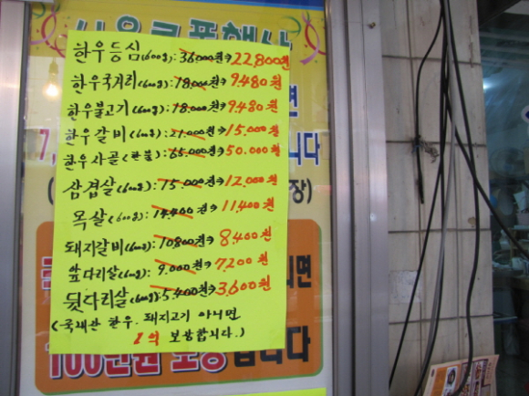 큰동해시장에는 식육점을 중심으로 한우고기 및 국내산 삼겹살 가격을 추석까지 크게는 50%까지 할인(600g 기준 : 한우등심 36,000원 → 22,800원, 한우불고기 18,000원 → 9,480원, 삼겹살 15,000원 → 12,000원)해 판매에 나서는 식육점 5개소가 등장했다.
