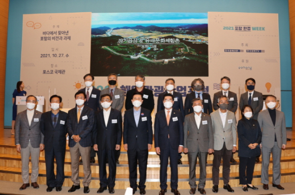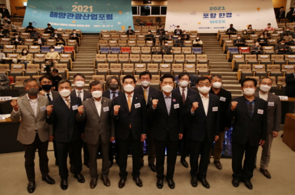 포항시가 27일 포스텍 내 포스코 국제관에서 ‘2021 포항 해양관광산업 포럼’을 개최했다. 이번 포럼을 통해 ‘바다에서 찾아낸 포항의 비전과 과제’라는 주제로 포스트 코로나 시대를 맞이해 해양레저관광 활성화 및 해양환경보전 방안을 마련한다는 계획이다. 사회적 거리두기 단계에 따라 사회자와 좌장을 포함한 최소한의 인원만 현장에 참석했다. 이번 포럼 세션1에서 해수욕 중심의 관광에서 벗어나 해양레저 스포츠 등으로 다양하게 변화하는 해양관광 트렌드에 맞춘 관광객 유입 방안을 모색하기 위해 국내 해양관광 산업 관계자를 비롯해 학계, 전문가 등 다양한 분야의 관계자들의 의견을 듣는 시간을 가졌다. 아울러, 세션2에서는 건강한 바다환경 조성을 위해 현재 용역을 진행 중인 ‘호미반도 국가해양정원 조성사업’과 관련한 내용이 다루어졌다. 해당 사업이 진행될 호미곶면, 구룡포읍, 동해면, 장기면 지역주민들에게 사업의 내용을 설명하기 위해 포럼을 생중계했다. 평소 사업에 관심을 보이던 주민들은 행정복지센터에 설치된 유튜브 생중계를 통해 현재 시에서 진행하고 있는 ‘호미반도 국가해양정원 조성사업’에 대한 궁금증을 해소하는 시간을 가지게 됐다.
