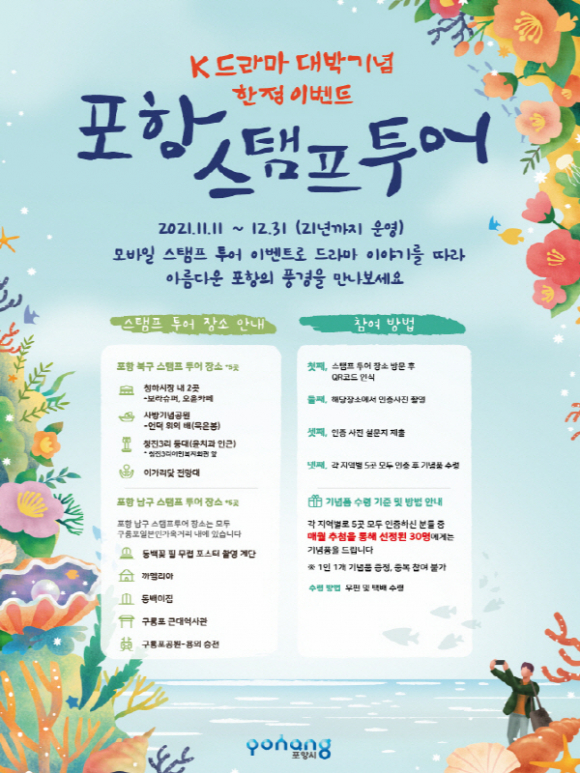 포항시는 드라마 ‘동백꽃필 무렵’ 흥행에 이어 최근 종영된 ‘갯마을차차차’도 연이어 흥행에 성공함에 따라 관광객들을 위한 이벤트 상품으로 K-드라마길 포항 스탬프 투어를 운영한다.
