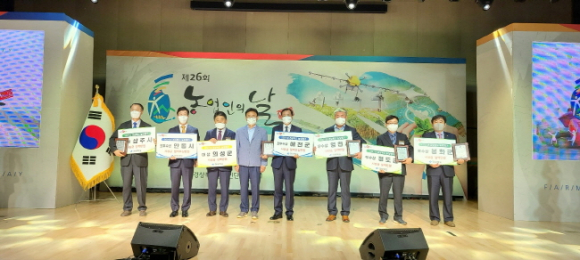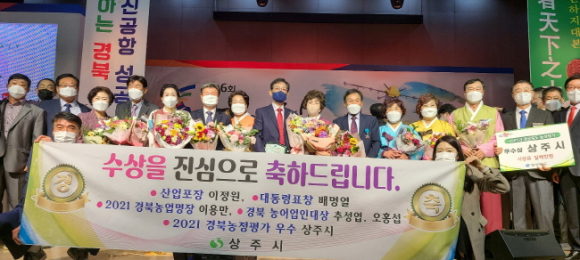 상주시(시장 강영석)는 11월 10일 경상북도 여성가족플라자 대강당에서 개최된「제26회 농업인의 날」기념식에서 시군농정평가 우수상, 정부포상 3점과 2021년 경상북도 농어업인대상 2개 부문 및 2021년 경북농업명장 등 총 7점을 수상했다. 정부포상에는 - 산업포장 참배수출단지 이정원 회장(사벌국면) - 대통령표창 사)한국상묘협회 배명렬 회장(내서면) - 국무총리표창 사)전국한우협회 상주시지부 손우빈 공성분회장(공성면) 경북도지사표창에는 - 경북농업명장 이용만씨(모동면) - 경상북도 농어업인대상 전체대상 추성엽씨(모동면) 채소특작부문 오홍섭씨(함창읍) - 경북 시군 농정평가 우수에 상주시가 수상하는 영예를 안았다.