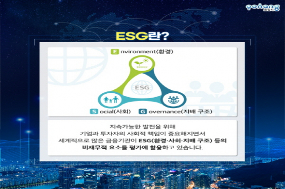 ESG(Environment·Social·Governance의 머리글자를 딴 단어, 탄소중립등 새로운 시대적 요구에 따라 ‘친환경, 사회적 책임 경영, 지배구조 개선’ 등 중요시되는 가치)는 말 그대로 지속가능성에 대한 것에 초점이 있다.