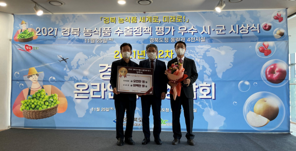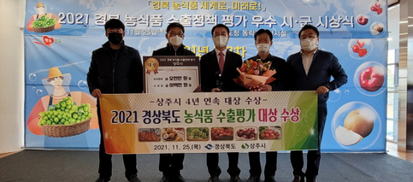상주시는 11월 25일 경상북도에서 개최한 ‘2021년 농식품 수출정책 우수시·군 평가’ 시상식에서 ‘대상’을 수상하고 상사업비 5천만원을 받았다. 이 평가는 경상북도 19개 시·군을 대상으로 농식품 수출실적 및 증감률을 기반으로 수출 확대를 위한 시군의 노력과 관심도를 반영했다. 상주시는 전년도 수출액 653억원 대비 113% 증가한 736억원의 실적을 거두었으며, 포도(195억원), 배(75억원), 곶감, 복숭아, 사과, 쌀 등 다양한 품목의 농산물을 해외 30여 개국에 수출했다. 특히 이번 평가에서 상주시는 안정된 수출 기반 조성과 해외시장개척 노력, 해외홍보관 운영 등 차별화된 수출 정책으로 농식품 수출 실적 및 증감률에서 높은 평가를 받았으며 2018년 이후 4년 연속 대상을 수상했다. 상주시는 이번 대상 수상으로 상주시는 명실상부한 수출 선도 지방자치단체로 자리매김했을 뿐 아니라 대한민국 수출 농업의 선구자임을 다시 한 번 확인했다고 밝혔다.