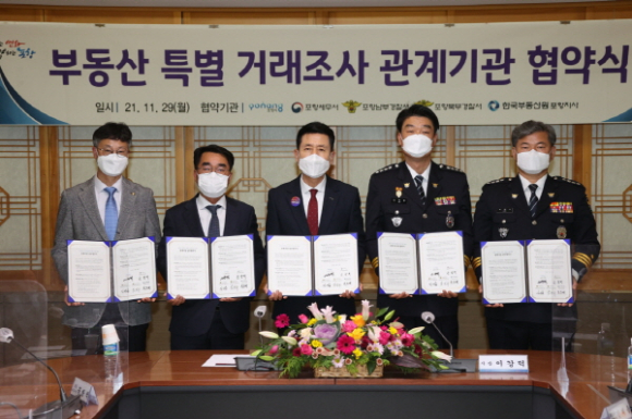 이강덕 포항시장은 29일 포항세무서(서장 공창석) , 포항남부경찰서(서장 김해출), 포항북부경찰서(서장 박봉수), 한국부동산원 포항지사(지사장 송수영)와 포항시민의 주거 안정과 불법거래 근절을 위한 부동산 특별거래조사 관계기관 협약식을 개최했다.