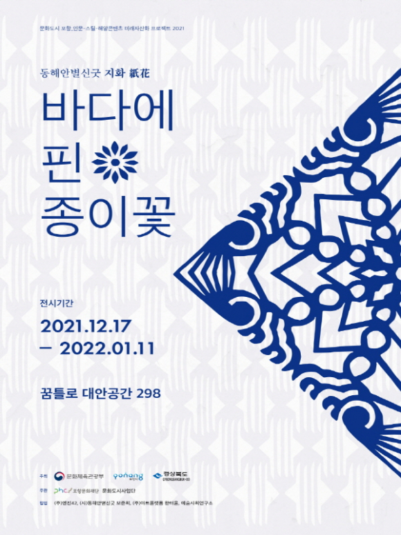 포항문화재단 문화도시사업단에서는 지역의 해양문화자산을 활용한 동해안별신굿 지화(紙花)공예전 ‘바다에 핀 종이꽃’을 2021년 12월 17일부터 2022년 1월 11일까지 ‘대안공간 298’에서 개최된다.