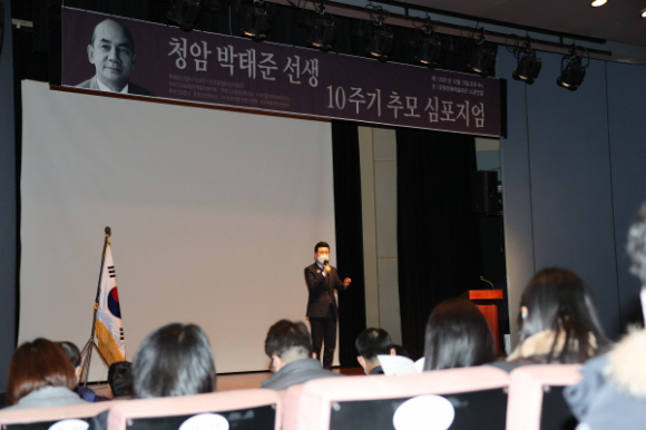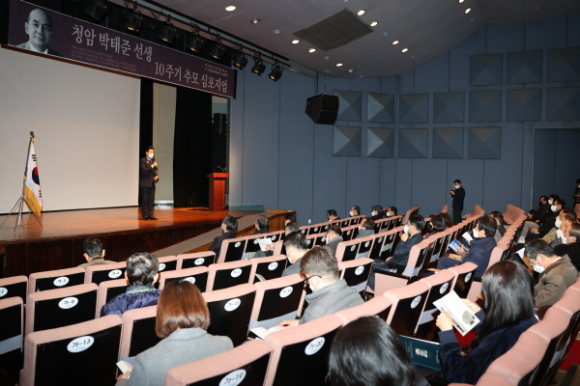 한편, 이날 오후에는 포항지역사회연구소의 주관으로 문화예술회관 소공연장에서 전상인 서울대 사회학 교수, 김왕배 연세대 사회학 교수, 이대환 작가를 초청해 ‘한국사회, 왜 박태준 정신을 부르는가?’라는 주제로 심포지엄을 개최했다. |  | | | ⓒ GBN 경북방송 | |