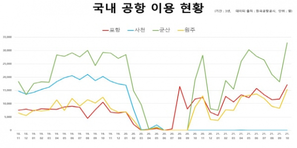 이 같은 결과는 한국공항공사 통계자료에서 잘 나타나 있는데 포항공항은 2019년까지 월 7천 명 수준의 탑승객이 이용해왔으나, 2020년 10월부터는 1만 2천 명 수준으로 올라섰다.