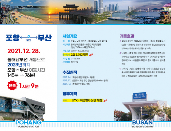 또한, 2023년까지 KTX-이음 열차가 운행이 되면 ‘포항~부산’ 간 이동 소요시간은 기존 145분에서 76분으로 대폭 단축될 예정으로, 비수도권 지역에서는 처음으로 대도시 간을 연결하는 광역전철이라는 점에서 상징성이 매우 크다. |  | | | ⓒ GBN 경북방송 | |