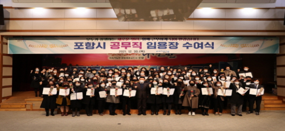 포항시는 30일 시청에서 정규직 전환채용 71명과 신규채용 3명 등 총 74명의 신규 공무직 근로자의 임용식을 개최했다.