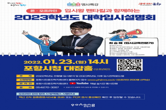 참석이 불가능한 시민들을 위해 포항시진로진학지원센터 유튜브 채널을 통해 실시간으로 ‘2023학년도 대학입시설명회’를 동시 진행한다.