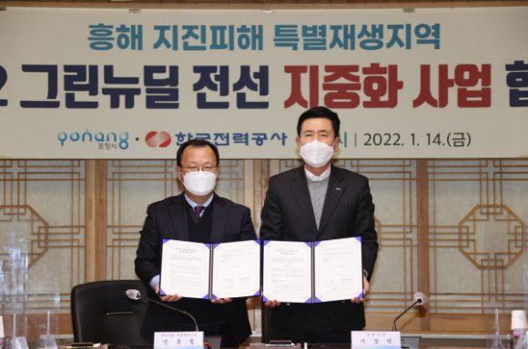 포항시는 한국전력공사 대구본부와 함께 14일 포항시청 중회의실에서 ‘2022 그린뉴딜 전선지중화 사업 협약식’을 개최했다.