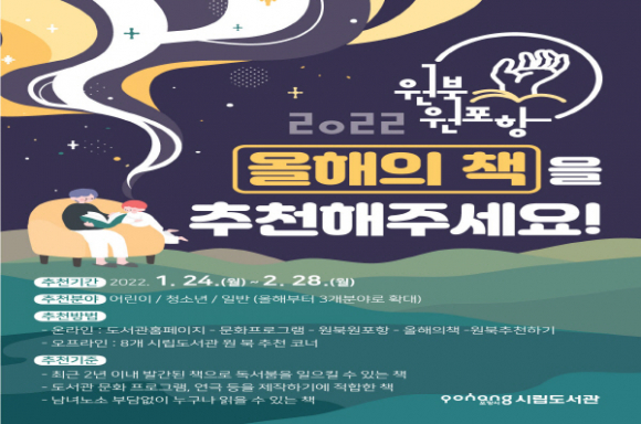 |  | | | ⓒ GBN 경북방송 | | 포항시는 ‘2022년 올해의 책’을 선정하기 위해 1월 24일부터 2월 28일까지 포항시립도서관 홈페이지와 8개 시립도서관 원 북 추천코너를 통해 후보도서를 추천받는다고 밝혔다. 17회째 추진되고 있는 ‘원 북 원 포항(One Book One Pohang)’은 시민들의 추천으로 한 권의 책을 선정하고 선정된 책을 통해 하나되는 포항을 만들고자 하는 범시민 독서진흥운동으로, 올해부터는 시민들의 의견을 적극 반영해 3개 분야(어린이, 청소년, 일반)으로 확대 운영할 예정이다.