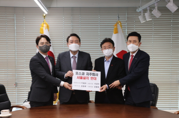 한편, 이날 국회 방문에 앞서 국민의 힘 당사를 방문해 윤석열 대통령 후보를 만나 포스코 지주사의 서울 설치 반대를 논의하고 함께 힘을 모으기로 했다.