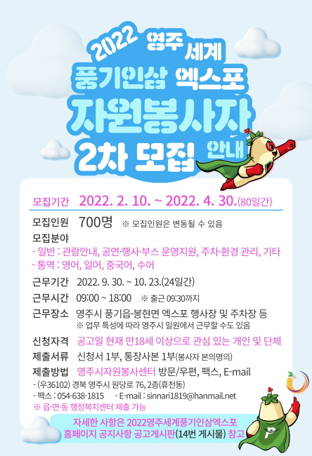 자원봉사자 모집과 접수에 관련한 자세한 사항은 영주세계풍기인삼엑스포(www.ginsengexpo.org) 또는 영주시자원봉사센터(www.yeongju1365.or.kr) 홈페이지에서 확인할 수 있으며, 기타 궁금한 사항은 엑스포조직위원회 행사운영팀(☎ 054-639-4822) 또는 영주시자원봉사센터(☎ 054-636-1815)로 문의하면 된다.