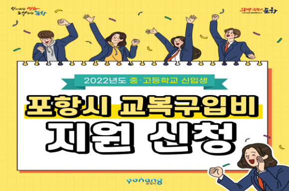 교복구입비 지원 신청은 2018년 발표한 교육복지 3無(무상교복지원, 무상급식, 무상보육)정책의 하나로 생활밀착형 복지 및 교육행복도시를 조성하기 위한 일환으로 시작된 교육정책이다. 지원대상은 포항시에 주민등록 주소를 두고 교복을 착용하는 중․고등학교에 입학하는 신입생이며, 교복 미착용 학교 학생의 경우에는 학교 교칙에 ‘생활교복’ 조항이 있으면 해당될 수 있다.