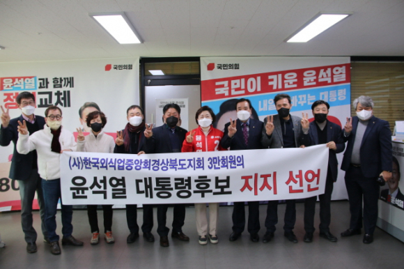 (사)한국외식업중앙회 등 자영업 대표 단체들의 국민의힘 윤석열 대통령 후보 지지선언이 이어지고 있는 가운데, 한국외식업중앙회 경상북도지회(지회장 김원길)도 윤석열 후보 지지선언에 나섰다.