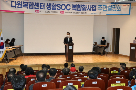 포항시는 30일 남구 오천읍민복지회관 다목적홀에서 ‘다원복합센터 생활SOC 복합화 사업 주민설명회’를 개최했다고 밝혔다. 이날 주민설명회는 이강덕 포항시장, 지역구 국회의원 및 시·도의원, 3개 읍·동(오천읍, 청림동, 제철동)의 이·통장 및 주민들이 참석한 가운데 건립사업의 추진상황 보고, 설계공모 당선작 발표 이후 사업추진에 따른 다양한 주민들의 의견을 수렴하는 시간을 가졌다. ‘다원복합센터 건립사업’은 지난 2020년 국무조정실 생활SOC 복합화사업에 공모 선정된 사업으로 지난해 6월 한국자산관리공사 캠코와 위·수탁계약을 체결해 위탁개발방식으로 추진되고 있으며, 현재 기본 및 실시설계 용역을 진행하면서 원활히 추진되고 있다. 다원복합센터는 지하1층, 지상4층으로 남구 오천읍 원리 일원에 건축연면적 8,860㎡ 규모로 건립되며, 주민생활과 밀접하면서도 다양한 용도로 활용될 수 있도록 대규모 실내수영장, 다목적체육관, 청소년문화의집, 다함께돌봄센터, 공공청사 등이 들어설 예정이다. 총사업비는 468억 원으로 2023년 3월 실시설계 마무리 후 2025년 8월 준공을 목표로 하고 있다. 포항시는 설명회에서 제시된 다양한 의견들을 적절하게 반영해 주민 모두가 공감할 수 있도록 설계단계부터 지역실정에 맞게 추진한다는 방침이다.