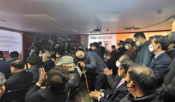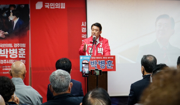 축사에 나선 송필각 전 경북도의회 의장은 “경주 구석구석을 돌아다니면서 의정활동을 오랫동안 수행한 경륜있는 토종 후보 박병훈을 밀어 달라”며 지지를 호소했다.