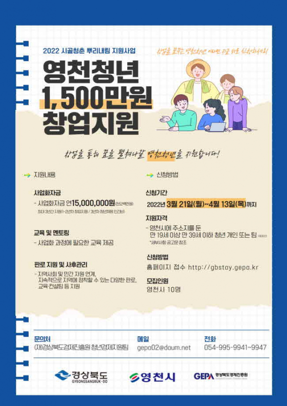 영천시와 운영기관인 경상북도경제진흥원은 예비창업을 준비하는 지역 내 청년들의 지역정착과 청년CEO들의 네트워크 활성화를 위해 ‘시골청춘 뿌리내림 지원사업’의 참여자를 오는 13일까지 모집한다. 이 사업은 청년층 안정적인 정착과 로컬창업 아이디어를 가진 청년창업가들을 발굴하고 창업 시작부터 정착, 사후지원까지 체계적인 창업 시스템을 통해 청년CEO로 양성하는 사업이다.