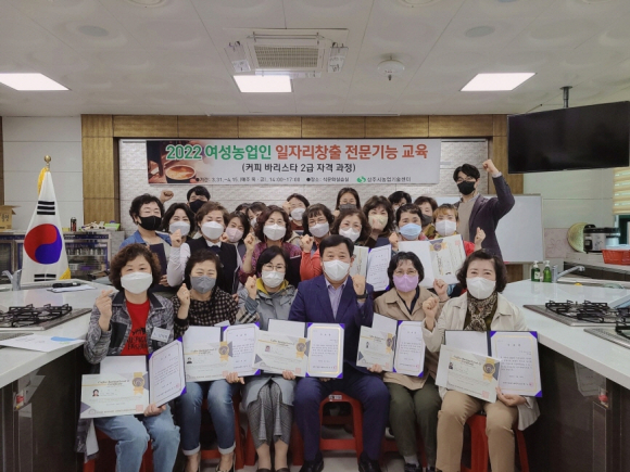 상주시농업기술센터(소장 최낙두)는 4월 15일 농업기술센터 식문화실습실에서 여성농업인 일자리창출 전문기능교육의 한 부분으로 진행된 커피 바리스타 2급 자격과정 종강식을 가졌다.
