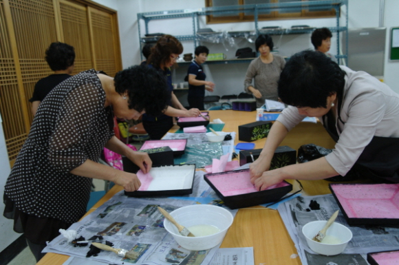 또한, 전통한지 공예반 역시 높은 출석률을 자랑하며 수업이 끝난 이후에도 자리를 뜨는 사람 없이 만들기에 열중이다. 골격을 만들고 속지를 붙이고 또 그 위에 오색 한지를 붙여 마치 전통한복을 입는 느낌의 한지공예는 작품하나가 완성되기 까지 수십 번의 손길이 더해져야 하는 작업으로 교육생 모두 한 작품 한 작품 정성들여 완성해가고 있다.