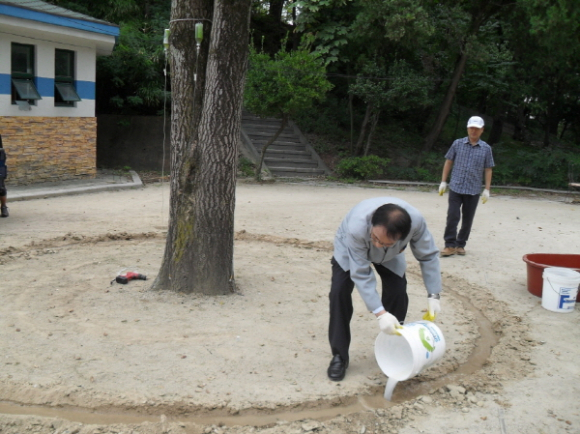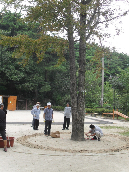 이번 행사는 덕수공원 내 게이트볼장 입구에 터줏대감처럼 서 있는 50년생(직경 50cm, 높이 20m) 은행나무가 최근 원인 없이 수세가 쇠약해지면서 잎이 말라 긴급하게 영양공급과 정상생육을 도모하기 위해 마련된 것이다.
