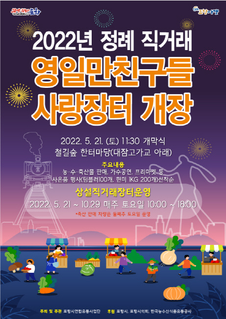 포항시는 오는 5월 21일부터 10월 29일까지 매주 토요일마다 ‘영일만친구들 사랑장터’를 개장한다고 밝혔다. ‘영일만친구들 사랑장터’는 철길숲 한터마당(대잠 고가교 아래)에서 매주 토요일 오전 10시부터 오후 6시까지 운영하며, 지역에서 생산한 신선한 농특산물을 직거래를 통해 시중가보다 10~20% 저렴하게 구입할 수 있다. 또한, 올해로 10회째를 맞아 포항시와 포항시연합유통사업단이 aT한국농수산식품유통공사의 공모사업에 선정돼 운영되고 있으며, 이번에는 코로나 일상회복과 다양한 판로확대를 위해 색다른 볼거리가 있는 철길숲으로 장소를 변경해 침체된 농가에 활력을 불어넣을 예정이다. 특히, 이번 직거래장터에는 25개 농가가 참여하고 친환경·GAP인증 농산물뿐만 아니라 수산물, 축산물, 프리마켓 공예품 등 다양한 품목을 판매하며, 일상회복과 지역경제 활성화를 위해 포항사랑상품권도 사용할 수 있다. 개막식 당일에는 2만 원 이상 구매한 고객 300명에게 현미(1kg, 200개) 및 텀블러(100개)를 사은품으로 증정하며, 풍물패 공연, 떡메치기, 볼불복 룰렛게임, 시식행사 등 각종 볼거리도 풍부하게 제공할 예정이다.