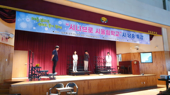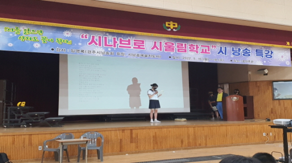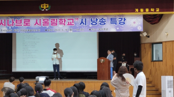 계림중(교장 이승태)에서 5월 16일부터 18일까지 3일간 3학년, 2학년, 1학년 순으로 전체 학생을 대상으로 ' 시울림학교 시나브로 시낭송 특강 '을 진행했다.