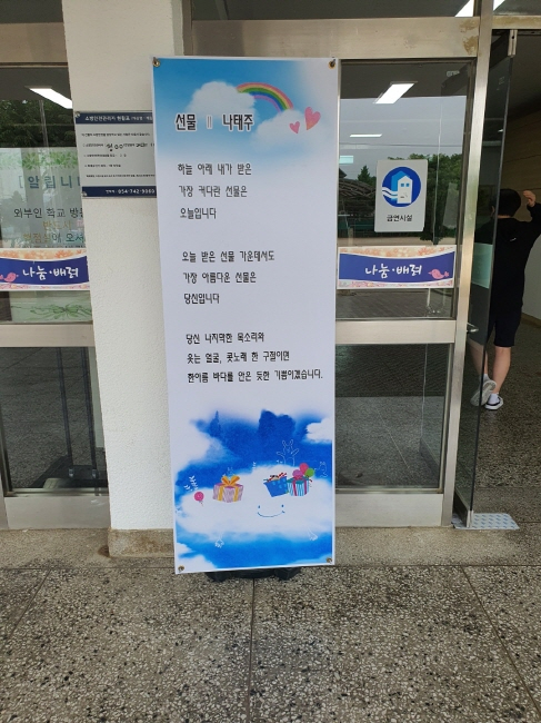 4월부터 수요일을 시요일로 정하고 학생들이 직접 교내 방송으로 시낭송을 온 교정에 울리고 있으며 이번 특강으로 더 많은 학생들이 시낭송을 직접하게 될것이라고 하며 본관 입구를 비롯한 11군데에 학생들의 애송시를 배너에 전시를 하고 있다고 한다. |  | | | ⓒ GBN 경북방송 | |