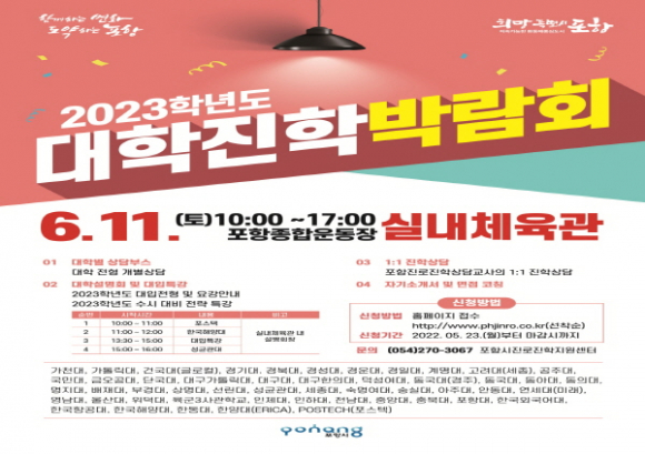 |  | | | ⓒ GBN 경북방송 | | 포항시는 오는 6월 11일 오전 10시부터 오후 5시까지 2023학년도 수험생 및 학부모를 대상으로 포항시종합운동장 실내체육관에서 ‘2023학년도 대학진학박람회’를 개최한다고 밝혔다.